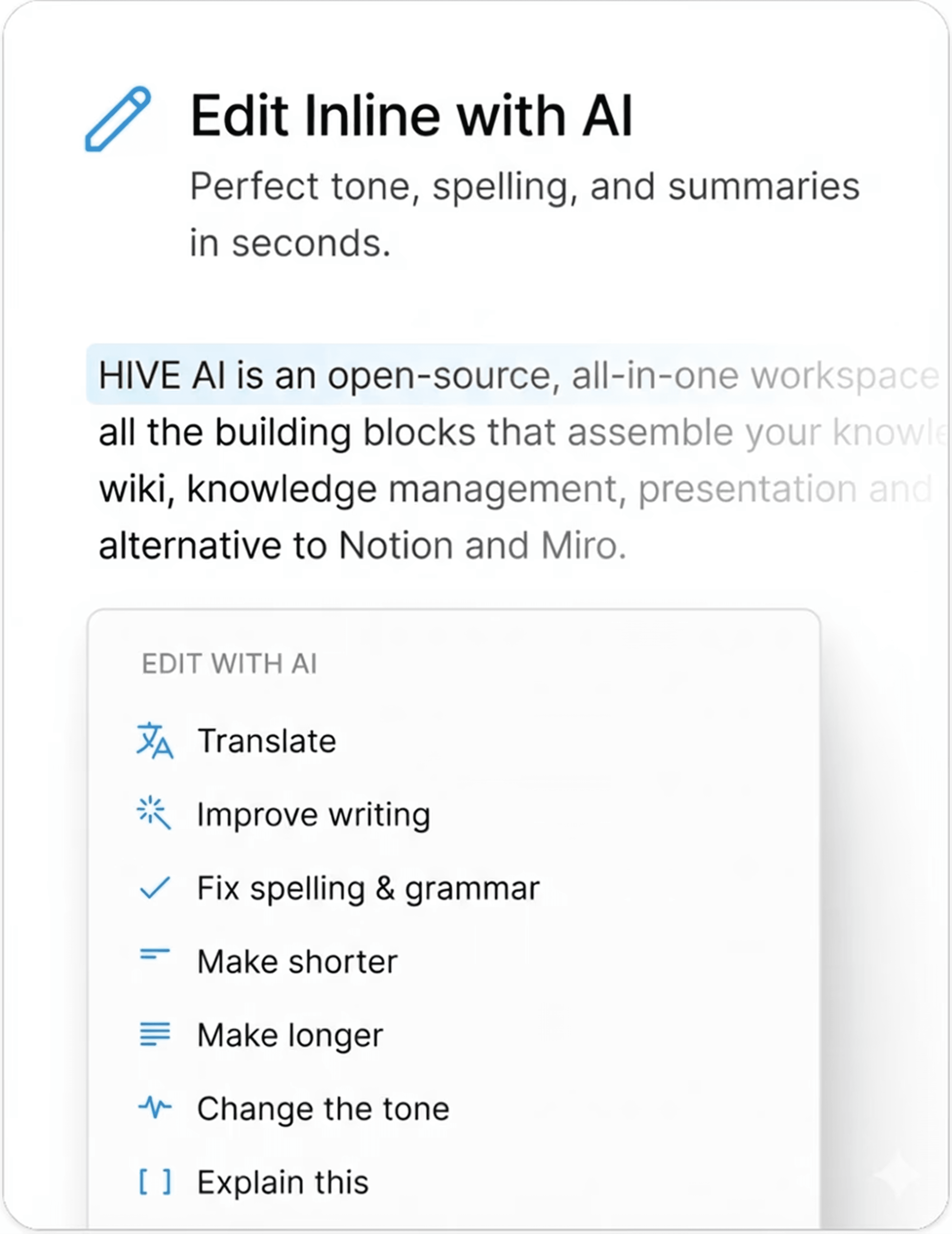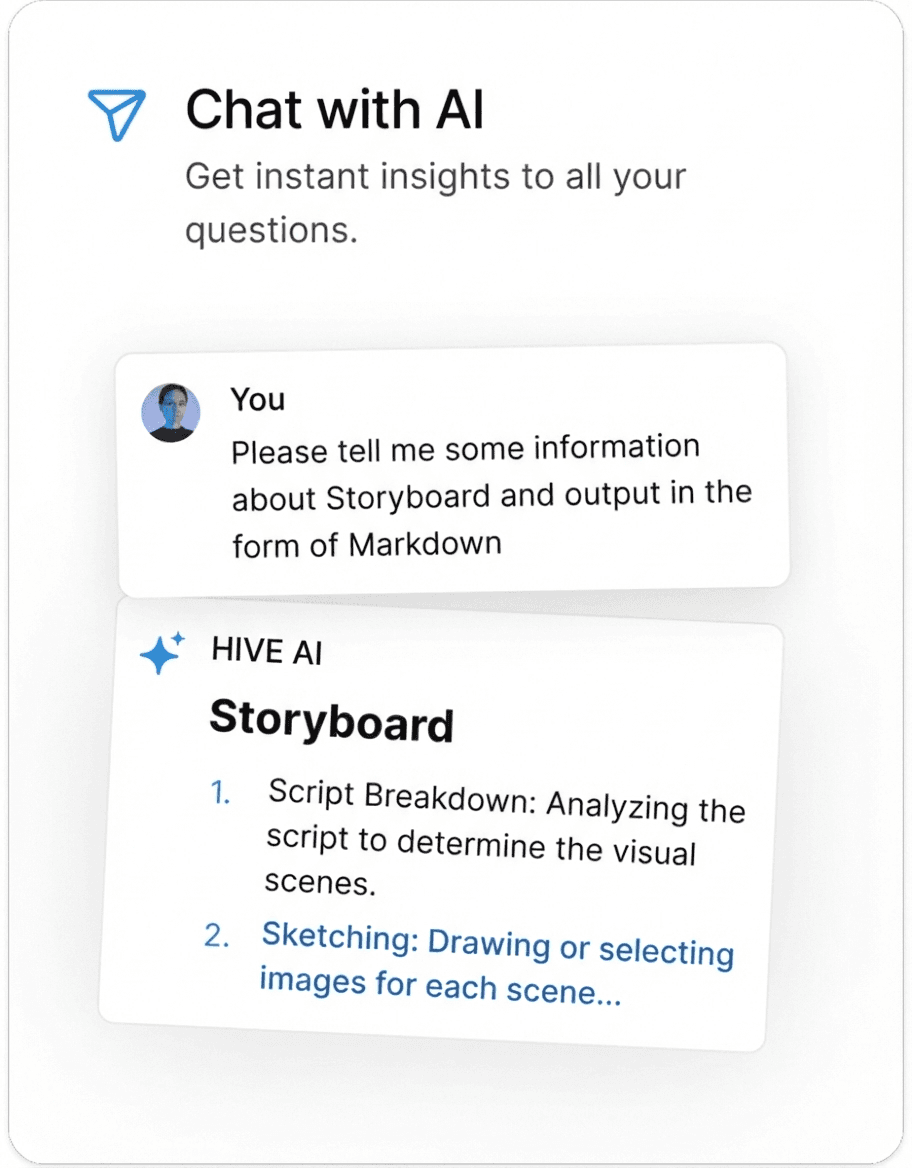 From structured documents to freeform whiteboards to organized databases Hive AI adapts to your workflow.